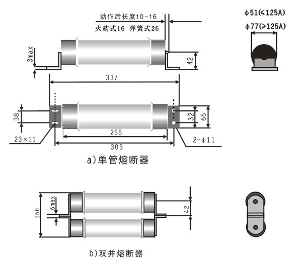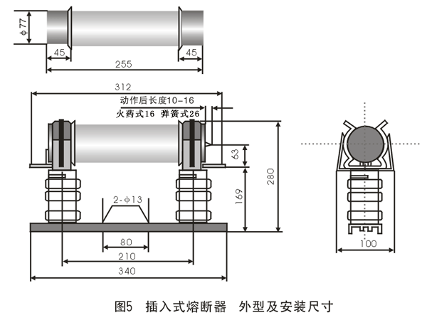 熔斷器的外型及安裝尺寸如(圖4)、(圖5)。